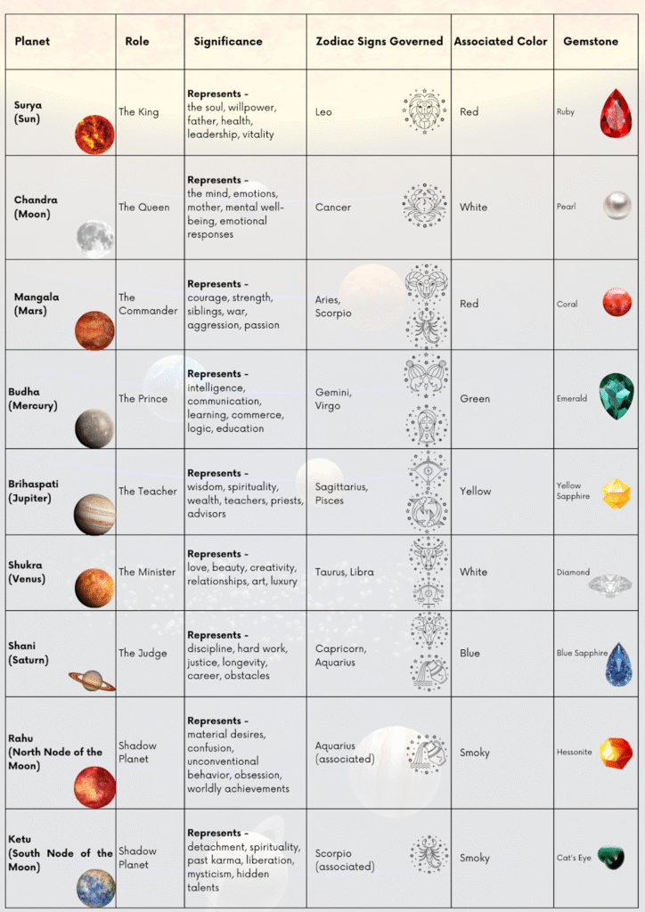 Table showing Navagraha (nine planets) in Vedic astrology with their roles, significance, zodiac signs, associated colors, and gemstones