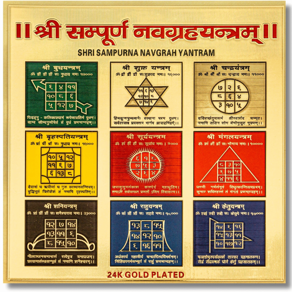 24K gold-plated Navagraha Yantra showing sacred geometric diagrams and mantras for the nine planets in Vedic astrology