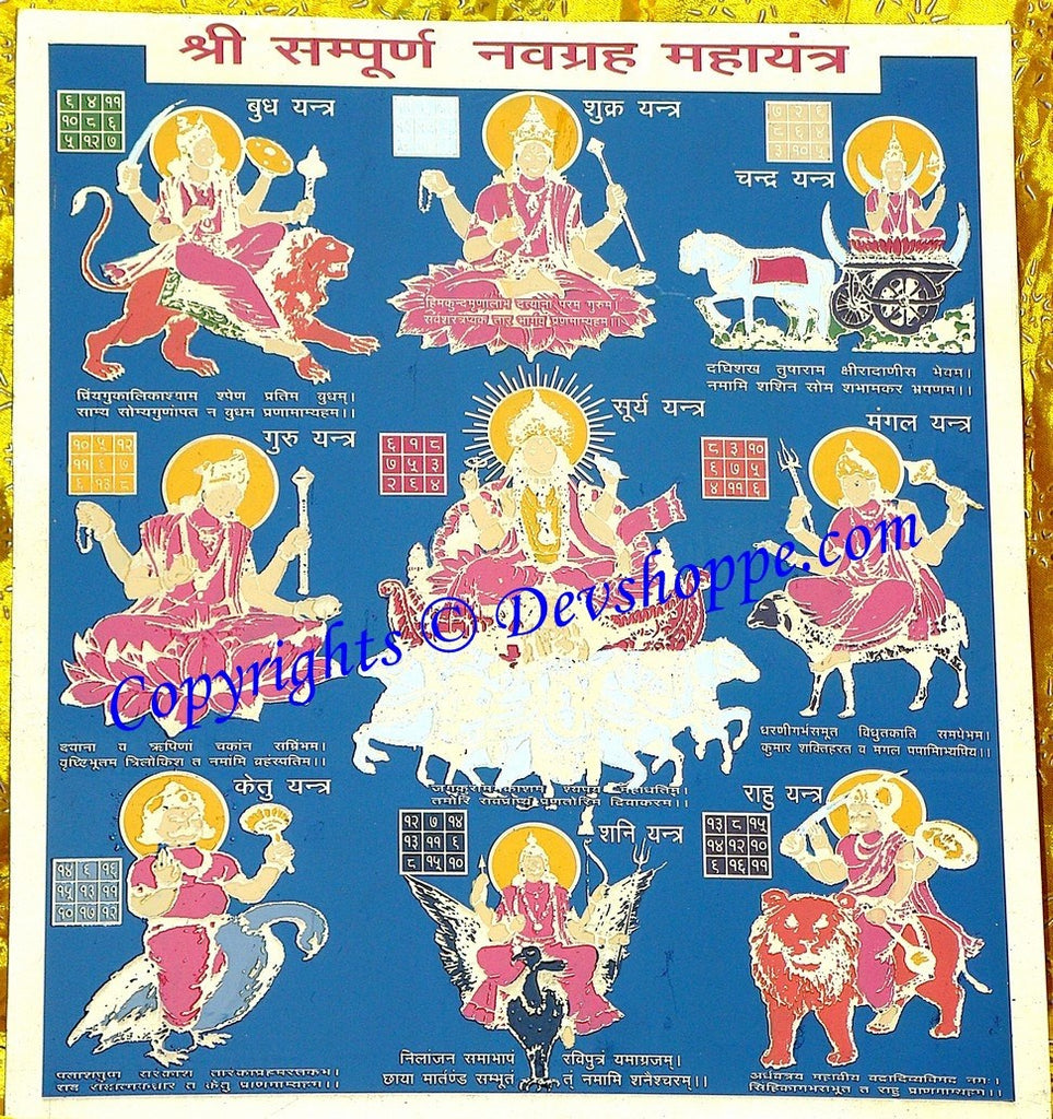 Traditional Navagraha yantra showing the nine planetary deities with their symbols and mantras for Navagraha Shanti Puja