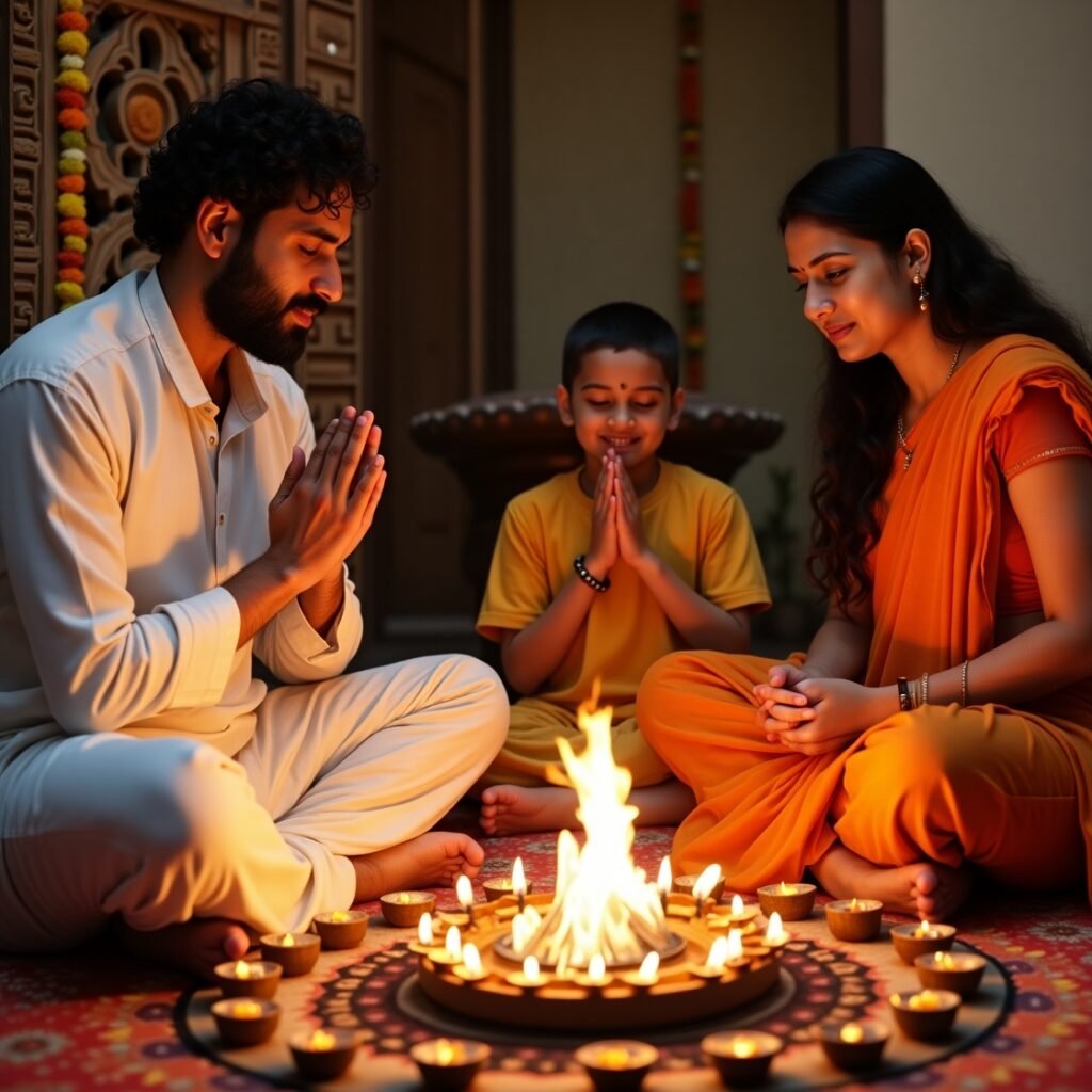 An Indian family performing Navagraha Shanti Puja at home with traditional attire and ceremonial fire