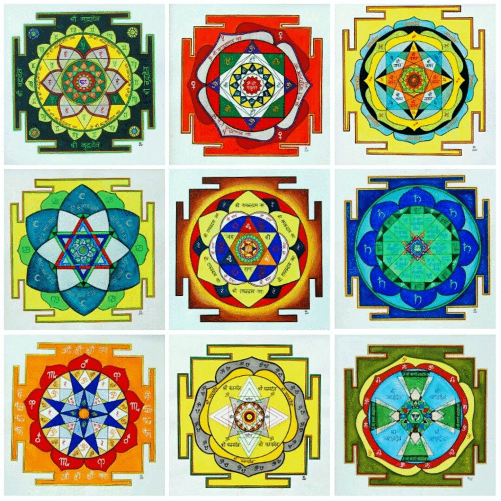 Nine colorful Navagraha yantras representing the nine planets from Vedic astrology in sacred geometric designs with traditional symbols and mantras