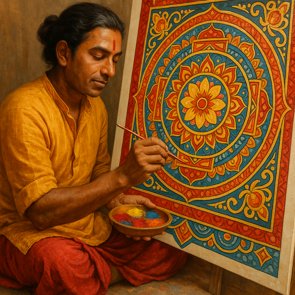 Hindu artist creating sacred mandala art representing creativity and self-expression
