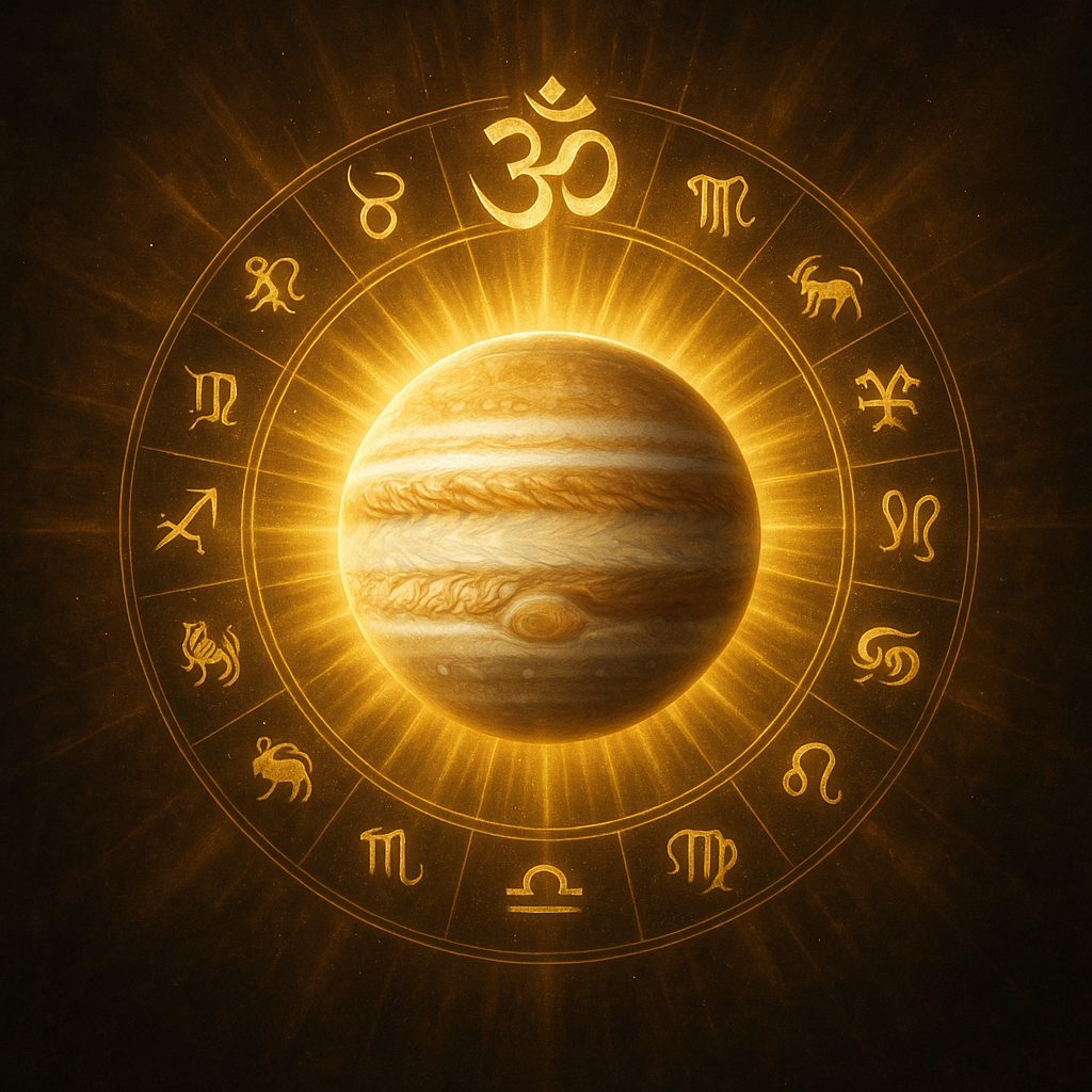 Jupiter and Sun planetary energy with Vedic astrology symbols and Sanskrit Om